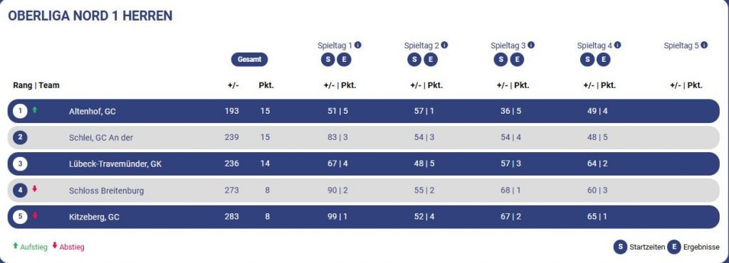 Mit insgesamt +48 Schlägen sicherte sich das Team Güby den Tagessieg und gewann 5 weitere Punkte in der Gesamtwertung. Der bisherige Tabellenführer, GC Lübeck-Travemünde, enttäuschte an diesem Tag und belegte den vierten Platz in der Tageswertung. Der Golf-Club an der Schlei übernahm gemeinsam mit Altenhof mit 15 Punkten die Tabellenführung.