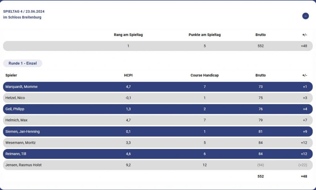 Der jüngste Spieler im Team, Momme Marquardt, lieferte eine herausragende Leistung auf dem Par-72-Platz ab. Er notierte beeindruckende 73 Schläge. Marquardt startete durchwachsen auf den ersten neun Löchern und erzielte 7 Pars und 2 Bogeys. Mit zwei Schlägen über Par ging er auf die zweiten Neun. An den Löchern 11, 12 und 13 gelangen ihm Birdies. Mit einem Schlag unter Par ging es für ihn auf die letzten 5 Löcher. Auf den Löchern 14 und 15 musste Marquardt jeweils Bogeys hinnehmen. Die letzten Löcher spielte er Par und kam so mit einem Schlag über Par ins Clubhaus.
