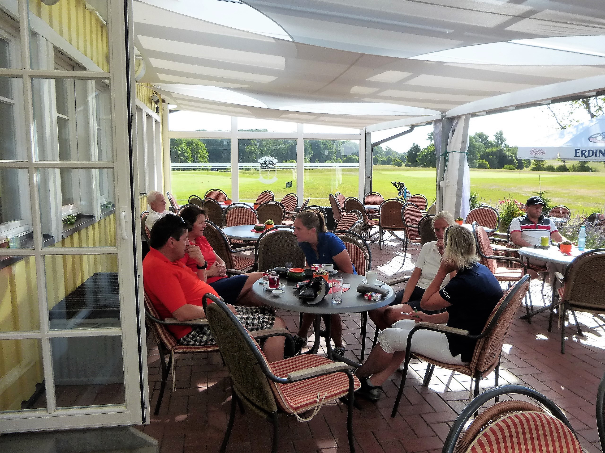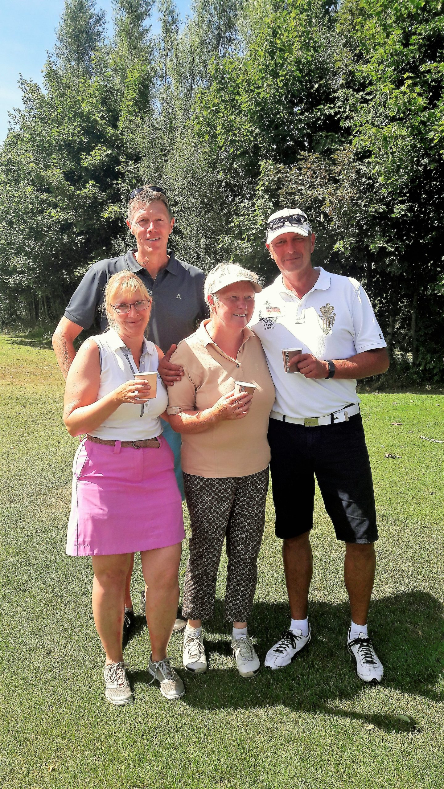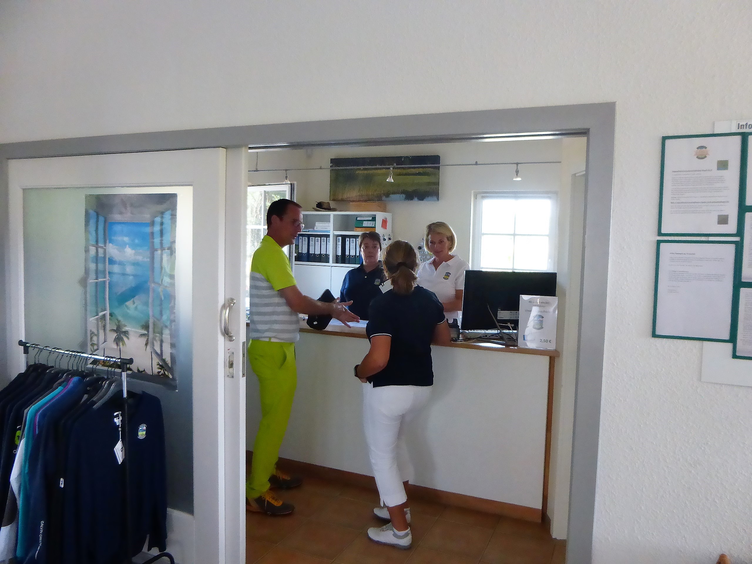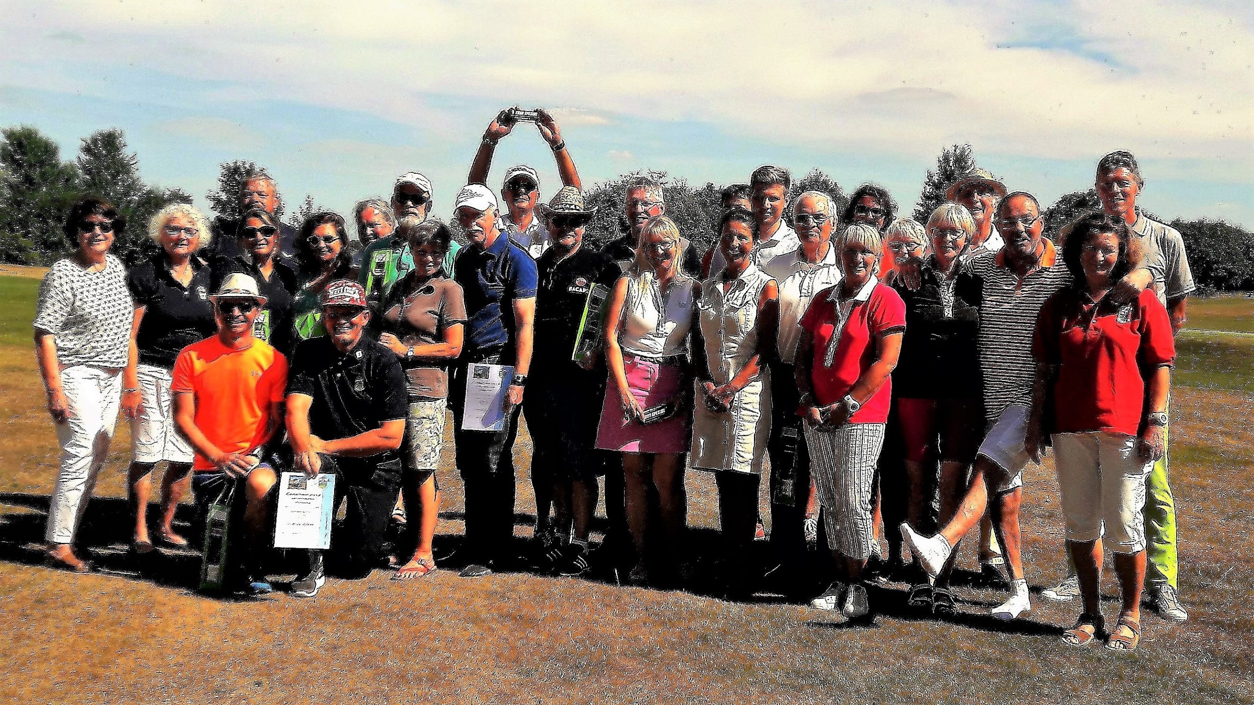 In diesem Jahr hatte das Betreiberturnier das Motto „Mallorca reloaded 2018“. Nachdem im letzten Jahr der Wettergott bei diesem Thema absolut nicht mitspielte und Dauerregen und Gewitter schickte, so dass das Turnier abgebrochen werden musste, war er in diesem Jahr dabei. Er wässerte am Tag vor dem Turnier den Platz, so dass es nicht ganz so staubig war und senkte damit auch die Temperaturen. Daher konnten die Flights dann fröhlich auf die Runde gehen. Die Flights und die Starttees wurden unter Aufsicht von Geschäftsführer Volker Schwarz von den Bürodamen gezogen. Es gab keinen, der mit seinem Team unzufrieden war. Gespielt wurde dann ein Texas-Scramble, bei dem einige Hindernisse zu überwinden waren. Zum Beispiel musste auf der Bahn 5 Speedgolf gespielt werden, auf der Bahn 17 musste ein von den Greenkeepern liebevoll dekoriertes Wintergrün angespielt werden, bei dem man nicht wusste, wie man das Loch treffen sollte. Die Bürodamen waren unterwegs mit Getränken und einem Ratespiel, bei dem man sich für 5 € und der richtigen Antwort 30 Meter erkaufen konnte.