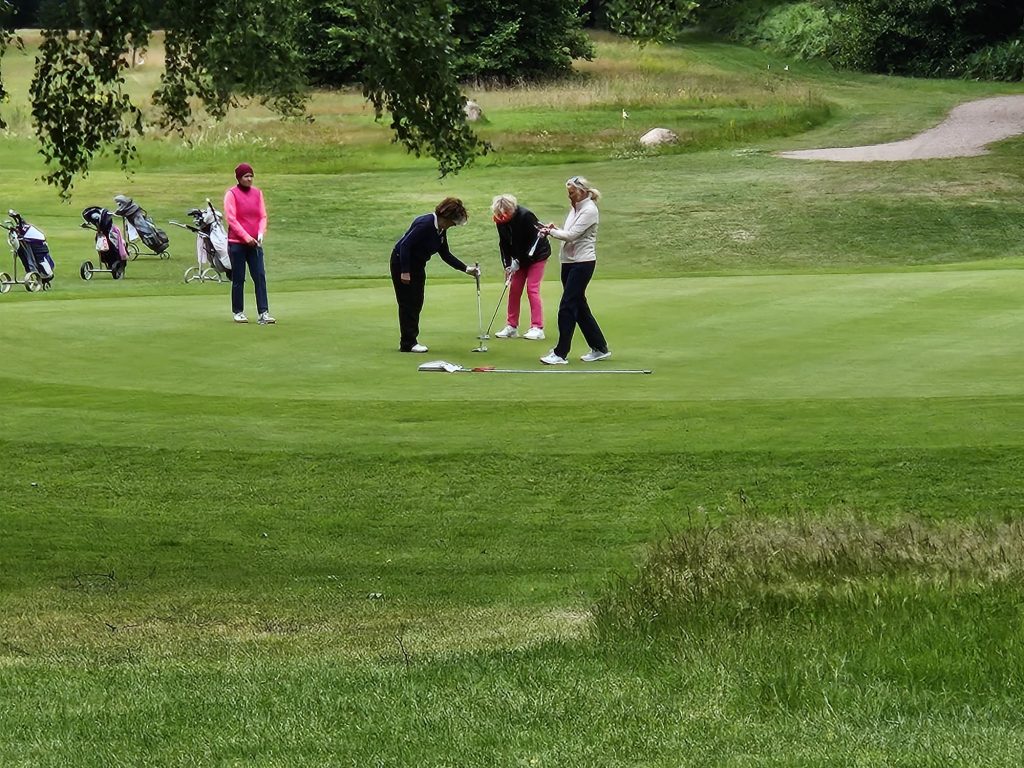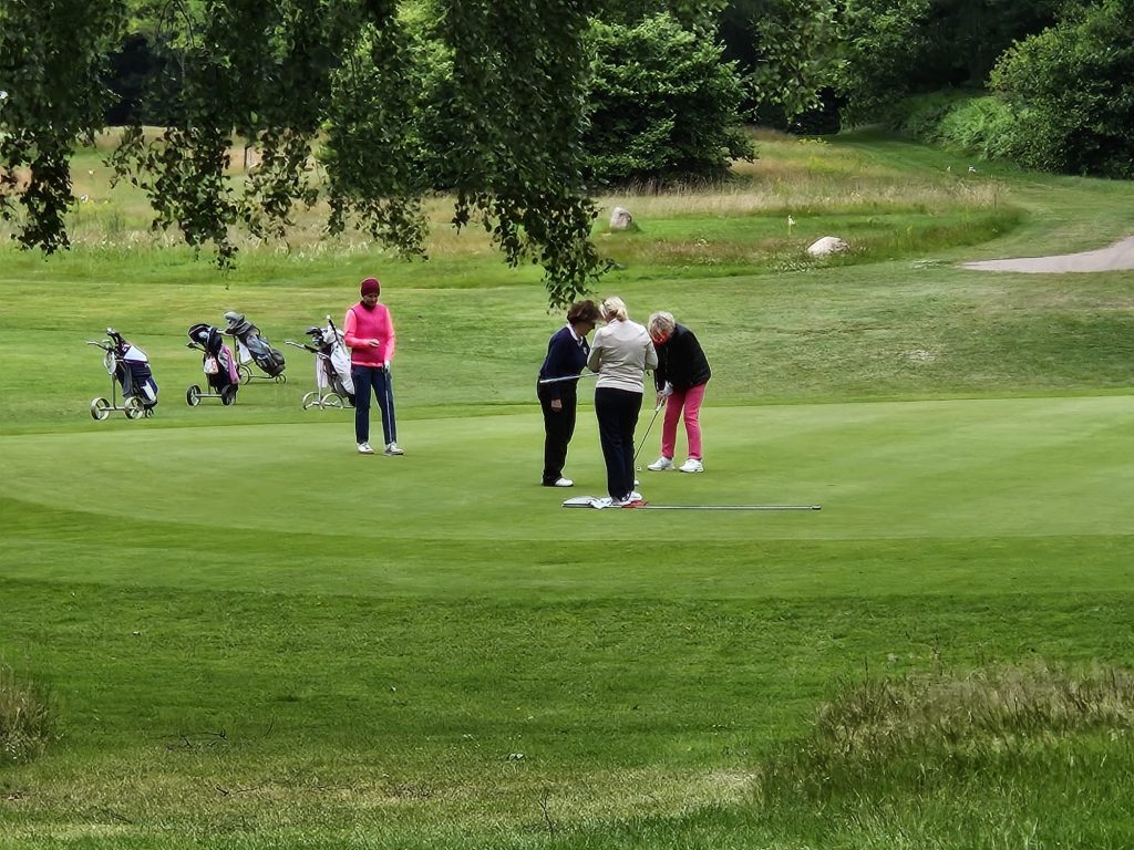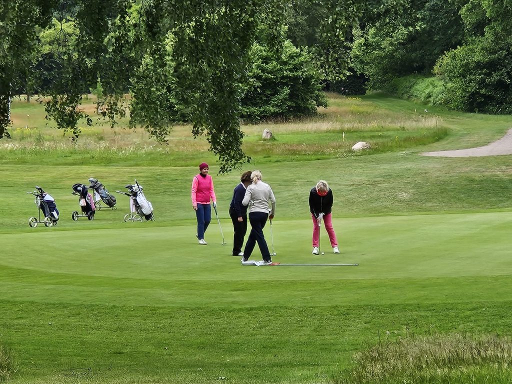 Bereits am Dienstagmorgen trafen sich die 13 gut gelaunten Teilnehmerinnen in Hoisdorf zum Auftakt der Tour. Bei frischen Temperaturen wurden erst einmal Mützen und Jacken übergezogen, ein obligatorisches Gruppenfoto geschossen – und dann ging es los mit dem ersten Wettbewerb: Gespielt wurde um die wenigsten Putts. Der abwechslungsreiche, sehr gepflegte und hügelige Platz in Hoisdorf, der sogar das Heimatgrün in Güby in den Schatten stellte, verlangte den Ladies einiges ab. Am Ende setzte sich Nicole Kelm mit 33 Putts knapp gegen Wilma Schwarz und Petra Winter (je 34 Putts) durch. Für ein Birdie auf Bahn 4 durfte sich Dietlind Behmer über einen Logoball des Clubs freuen.