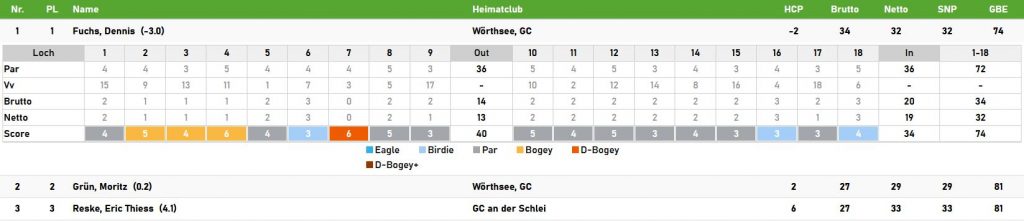 Die Bruttowertung war fest in bayerischer Hand. Dennis Fuchs vom GC Wörthersee notierte 74 Schläge auf seiner Scorekarte und erspielte damit 34 Bruttopunkte. Lag er nach 9 Löchern noch 4 über Par, spielte er die zweiten neun Löcher 2 unter. 7 Par und 2 Birdies. Was für eine tolle Runde. Den 2. Platz belegte sein Clubkamerad Moritz Grün mit 27 Punkten vor unserem Eric Reske mit ebenfalls 27 Punkten.