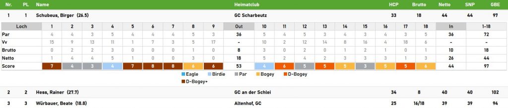 In der Nettowertung setzten sich dann aber Schleswig-Holsteiner durch. Birger Schubeus vom GC Scharbeutz brachte eine 97 ins Clubhaus, die zu 44 Punkten führten. 2 Birdies auf seiner Runde waren dabei sehr hilfreich. Rainer Hess vom GC an der Schlei und Beate Würbauer vom GC Altenhof folgten ihm mit Respektabstand.