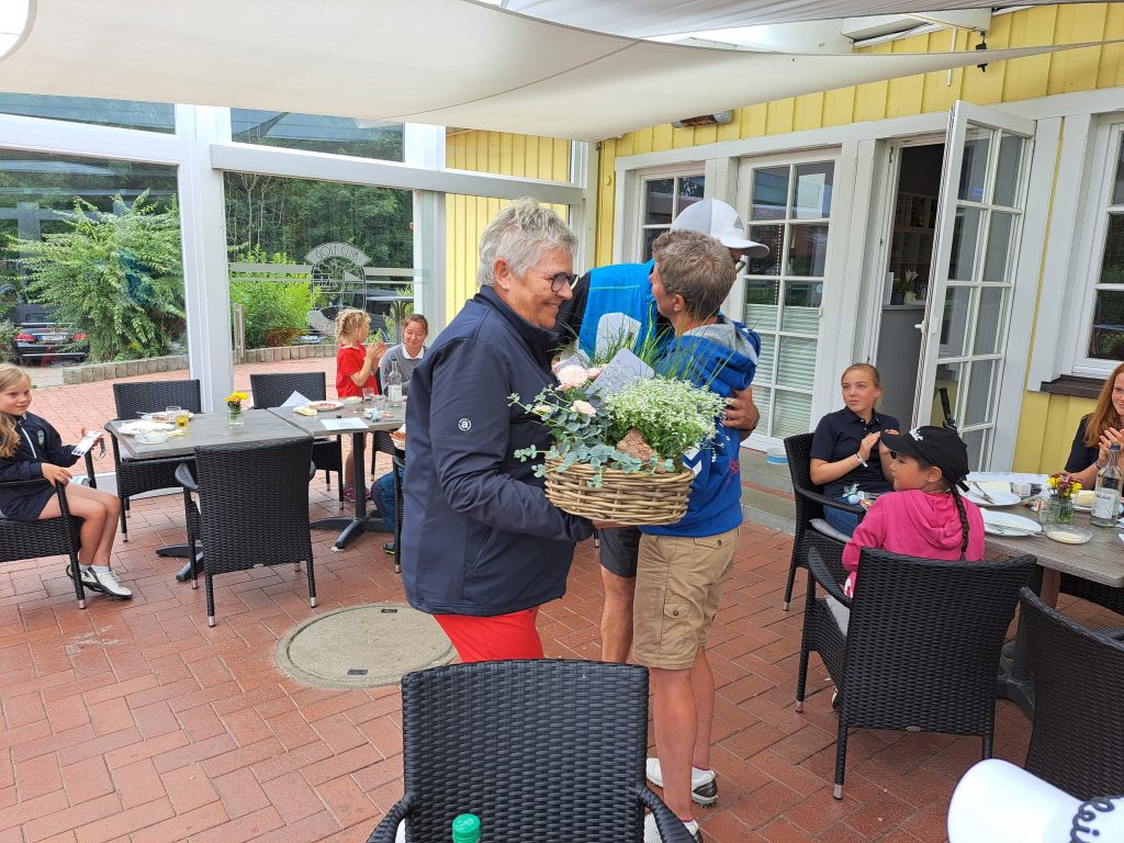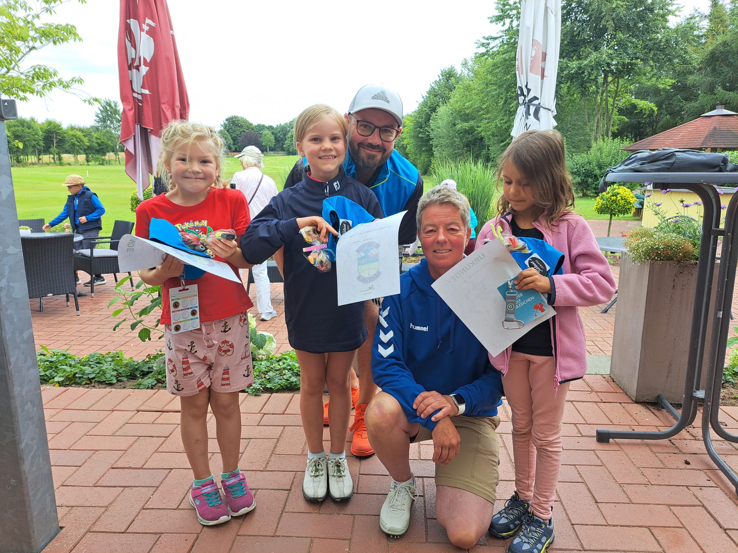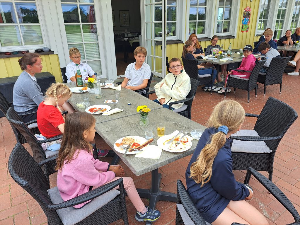 Im Anschluss gab es noch ein gemeinsames Abschlussessen. Bei der folgenden „Siegerehrung“ wurden alle Kids mit einer Urkunde für die Teilnahme und kleineren Preisen für ihre tollen Leistungen belohnt. Steffi Zilch präsentierte stolz die von den Minis erreichten Golfabzeichen in Bronze und Silber. Mette Jensen verlas noch die Ergebnisse der handicaprelevanten Runden. Während aller Turniere boten unsere Kids spektakuläre Ergebnisse. Im 18 Loch Turnier am Dienstag brauchte Jonas Jensen nur 98 Schläge und erspielte sich damit 61 (in Worten einundsechzig) Nettopunkte. Charlotte Krützfeldt belohnte sich mit 55 Nettopunkten und Luisa Sarcina bestätigte mit 52 Punkten die sehr guten Leistungen in dieser Saison.