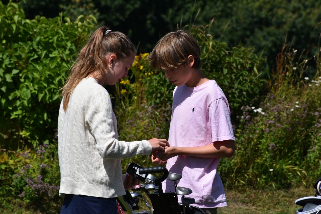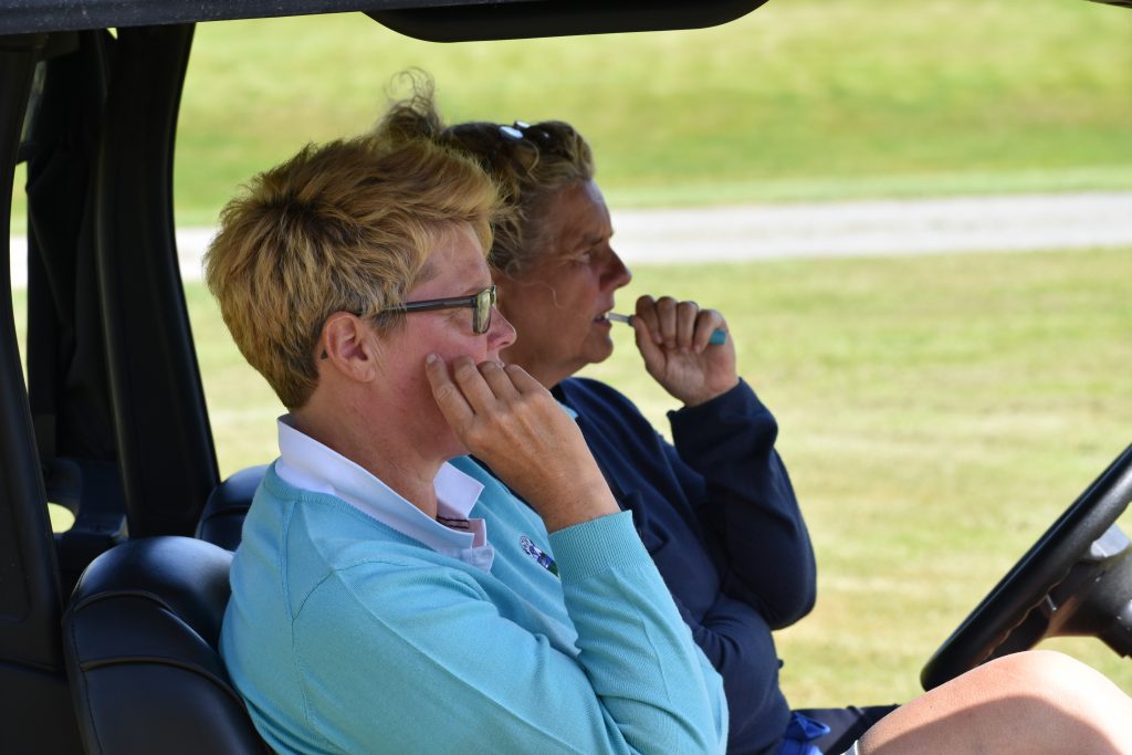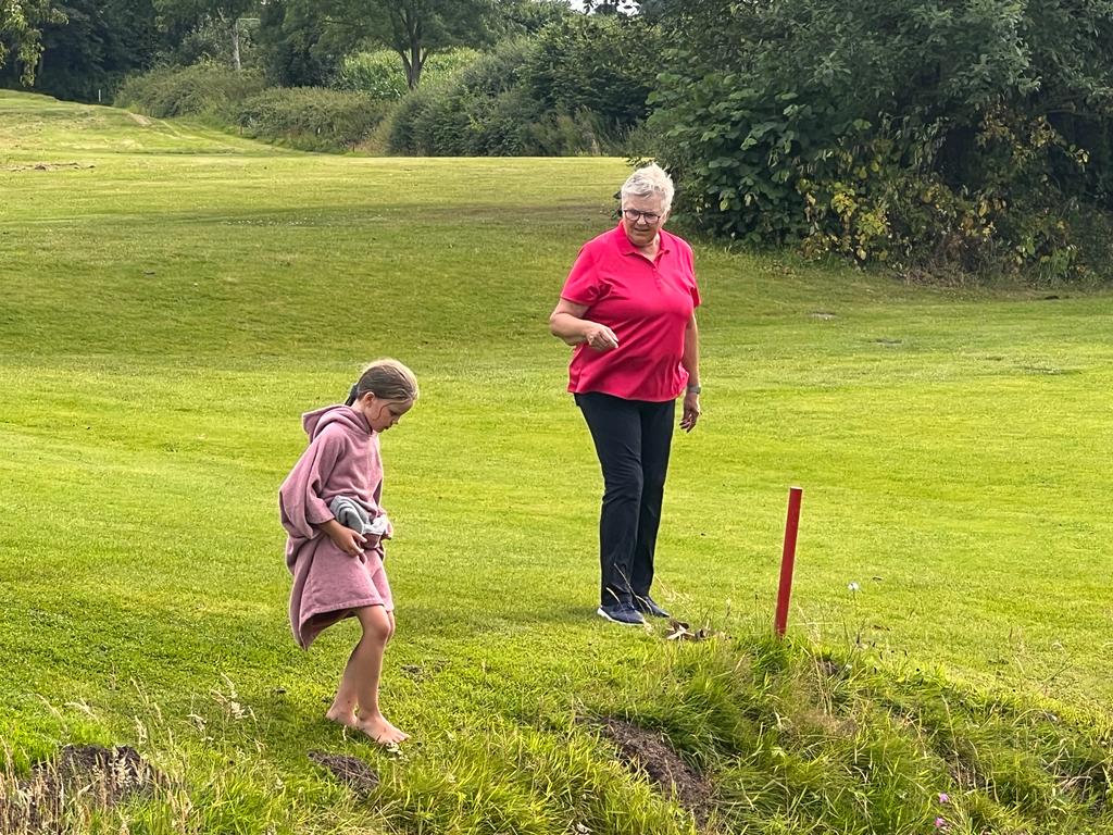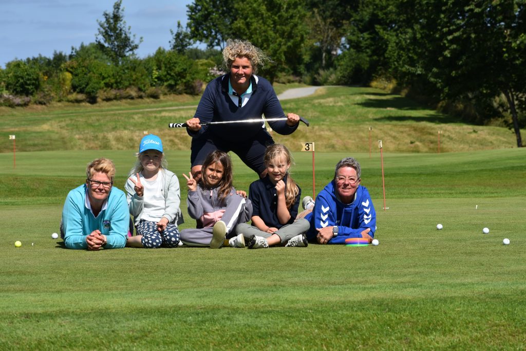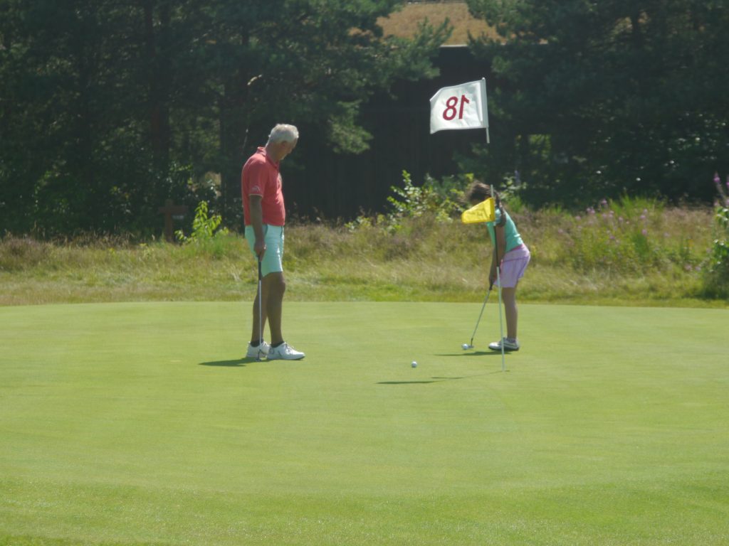 Der Abschluss dieser ereignisreichen Woche wurde mit einem Erwachsenen / Kids Turnier am Freitag eingeläutet. Mette Jensen hatte sich hier für einen 4er Texas Scramble entschieden. Dazu hatte sie sich noch allerlei “ Gemeinheiten “ ausgedacht. Die erste bekamen alle Erwachsenen schon beim Abschlag an der 1 zu spüren. Mette ging von einem zu anderen und sammelte alle Driver und Hölzer ein. Eisen spielen war angesagt. Weiter hatte sie sich für die Bahnen noch andere Besonderheiten ausgedacht. Z. B. durfte das Grün der 1 nicht direkt angespielt werden, sondern es musste der Bunker vor dem Grün genutzt werden. Sonst für viele eine unangenehme Lage, diese Mal war es gar nicht so leicht den Bunker absichtlich zu treffen. An anderen Bahnen durfte nur der grüne Abschlag genutzt werden. Ein riesiger Spass für alle. Mette und Nicole Martin fuhren alle Flights ab. Die Kids konnten für ihre erwachsenen Flightpartner mit der richtigen Beantwortung von Regelfragen, die am Start einkassierten Hölzer zurück erspielen, was auch in den meisten Fällen gelang.