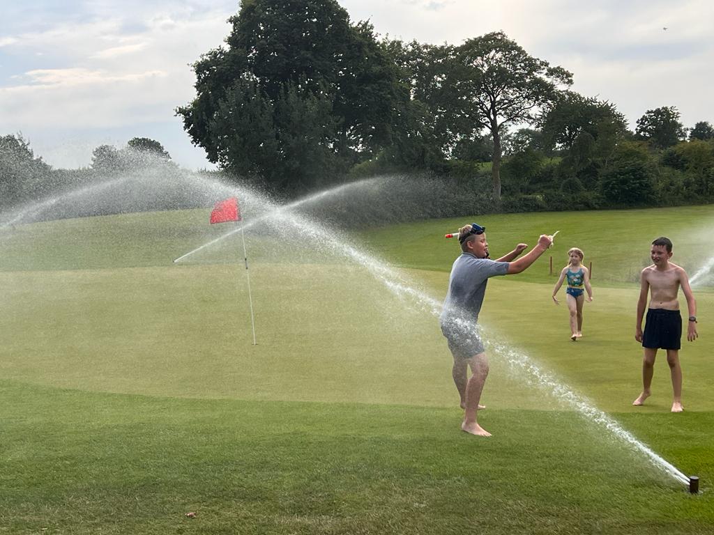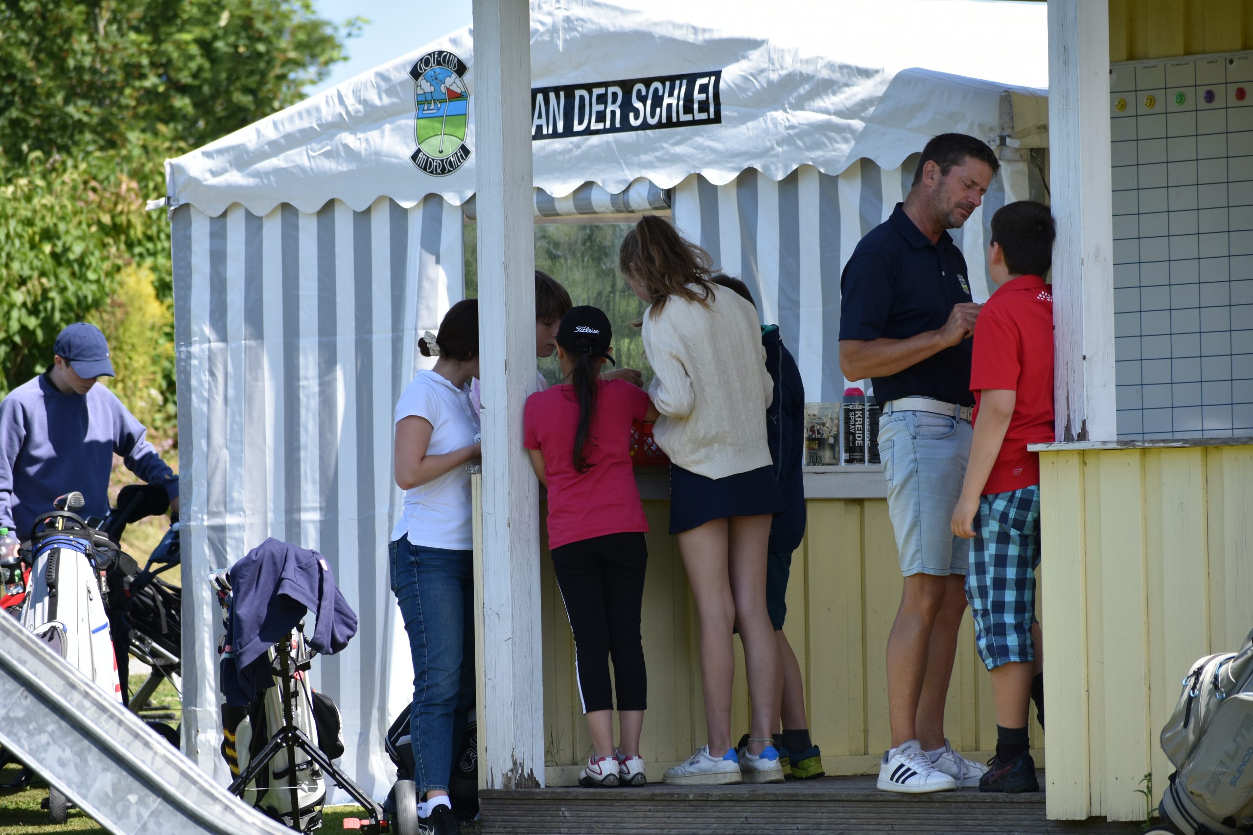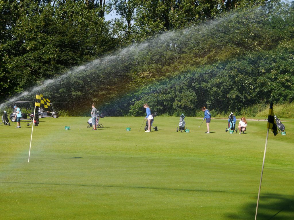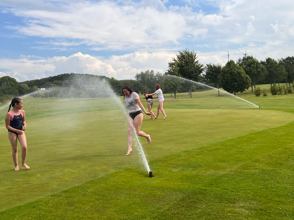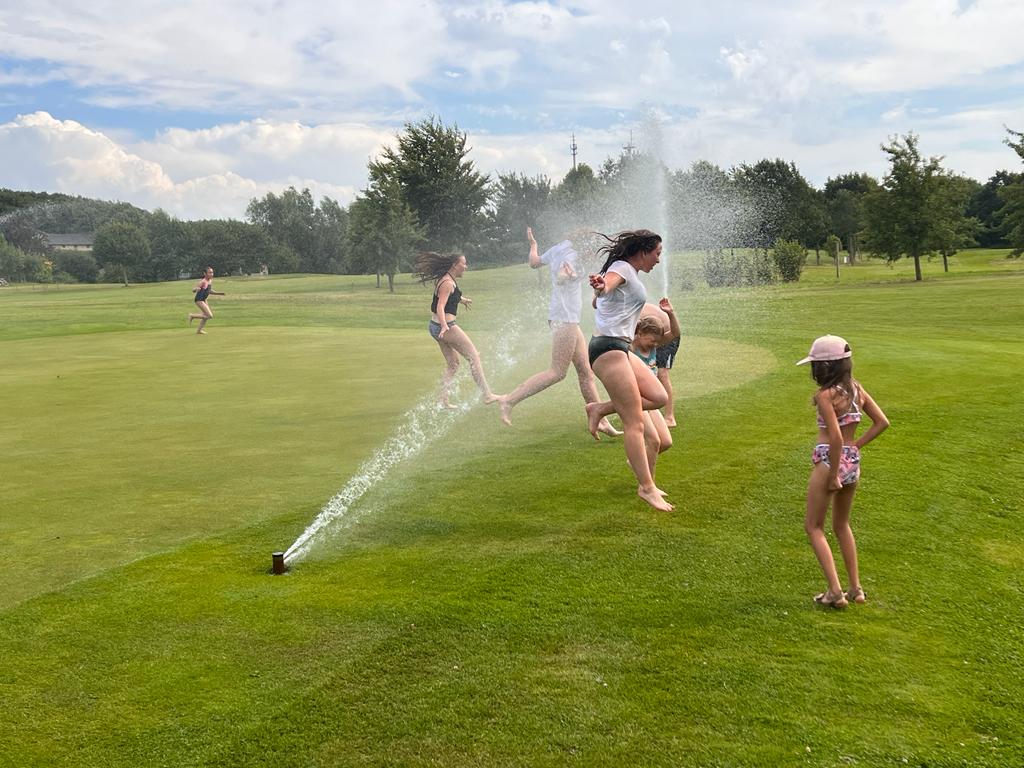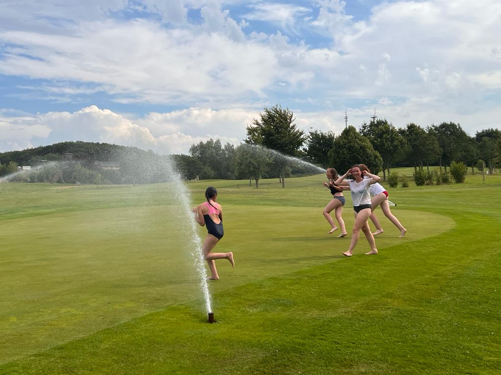 Am Donnerstag trafen sich nach Abschluss des Tages Eltern, Betreuer und Jugendliche zum gemeinsamen Grillen vor der Jugendhütte. Eine gute Gelegenheit, um sich besser kennen zu lernen und für die Kids die Möglichkeit auch abseits des Golfsports Zeit miteinander zu verbringen. Viele der Jugendlichen nutzten das traditionelle Bälletauchen im Teich der Bahn 9, um sich von den heissen Temperaturen des Tages abzukühlen. Nicht nur die Kids, auch Erwachsene machten dem maritimen Anspruch des GC an der Schlei alle Ehre. Per SUB wurde der Teich der 9 befahren und als sonniges Plätzchen genutzt. Die Rasensprenger des Grüns sorgte dann entgültig bei allen Kids für ausgelassene Stimmung.