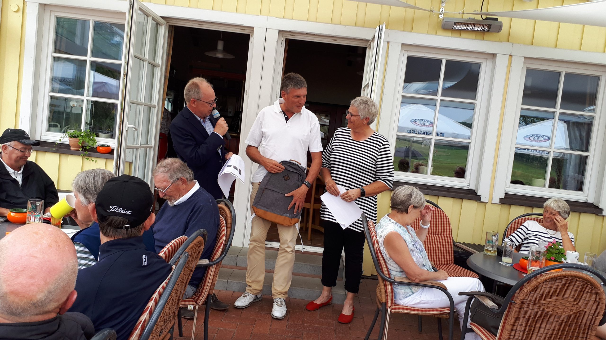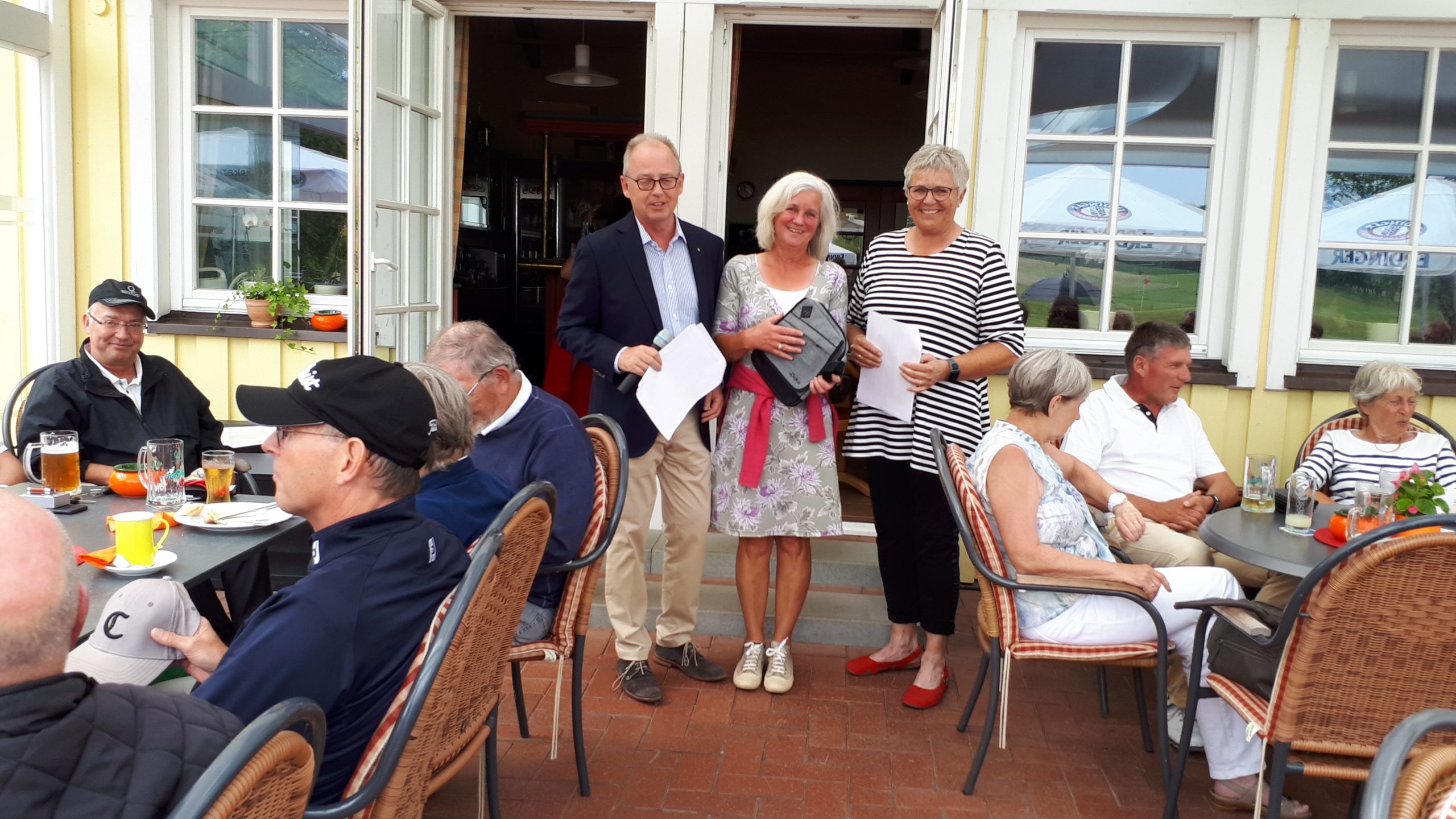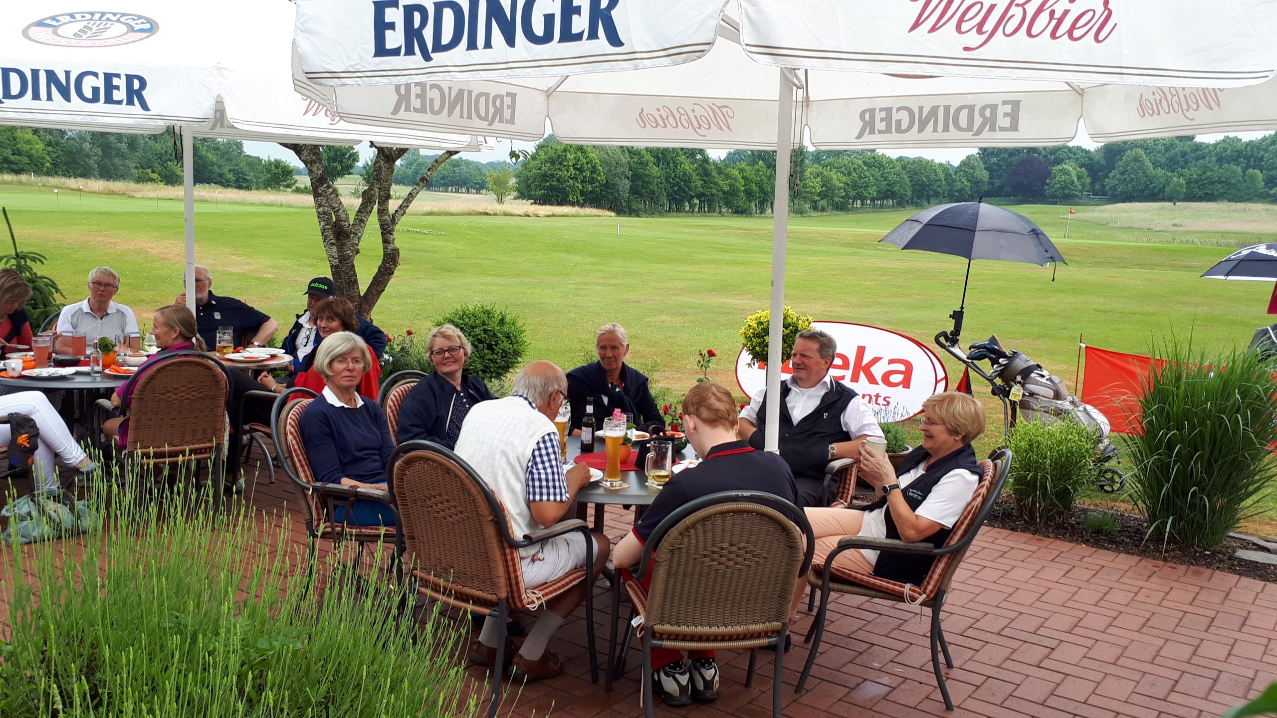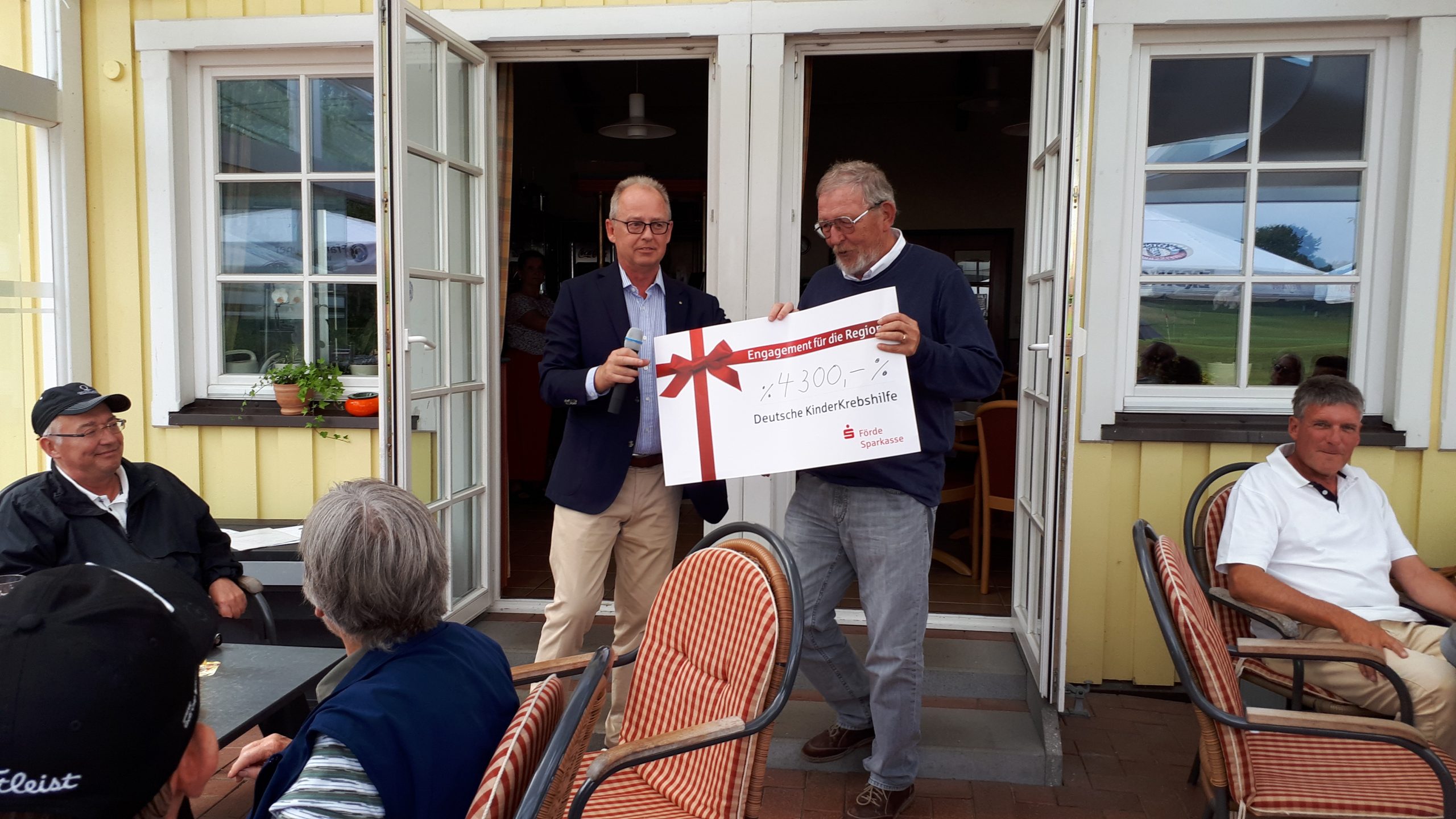 Es ist schon eigenartig, die ganzen Wochen vor diesem Turnier der Fördesparkasse nur allerbestes Wetter und dann pünktlich zum Startsignal fing es an zu nieseln und hörte erst bei Turnierende auf. Aber der guten Laune tat es keinen Abbruch, schließlich war man ja für einen guten Zweck unterwegs. Nachdem man sich dann das leckere Essen von Gudrun Raschke und ihrem Team hat schmecken lassen, ging es zur Siegerehrung durch Ulrich Boike. Netto-Sieger in der Klasse A wurde Tim-Hendrick Borchert, der gleichzeitig auch Brutto-Sieger wurde. In der Klasse B siegte Hermann Autzen und in der Klasse C Thomas Jundel. Den Brutto-Sieg bei den Damen holte sich Anna Bejeuhr vom GC Lohersand. Zusammen mit der Förderung der Sparkasse für jeden Nettopunkt, der Startgebühr und Spenden kam dann ein Betrag von 4.300 € zusammen.