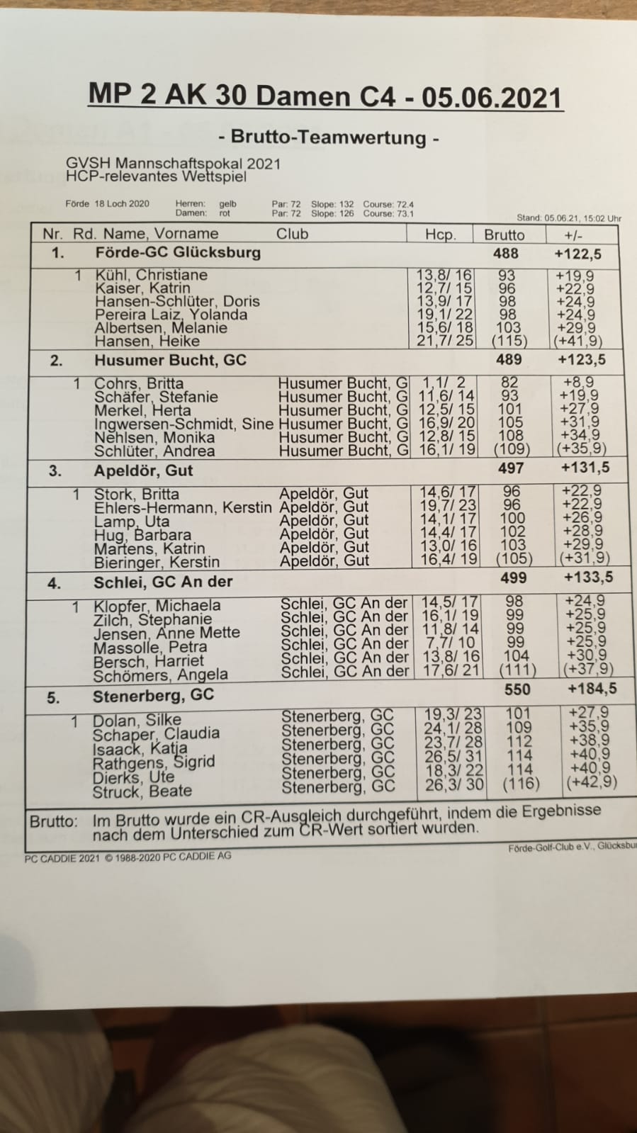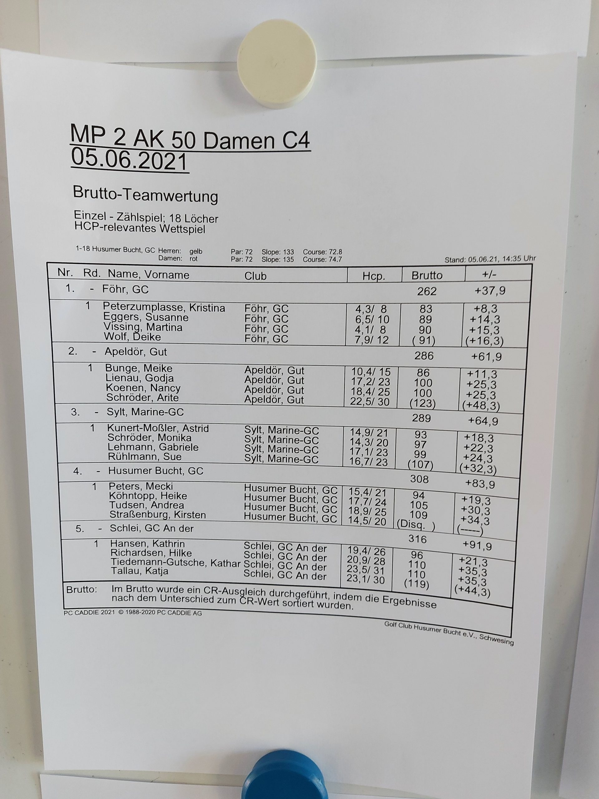Die Damen des GC Föhr dominierten die Teamwertung . Klar distanzierten sie mit 262 Schlägen die Mannschaft aus Apeldör(286) und vom Marine GC Sylt(289). Unsere Mannschaft(316) musste sich hinter den Gastgeberinnen vom GC Husumer Bucht (308 Schläge) einreihen.