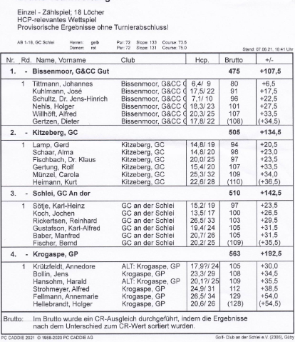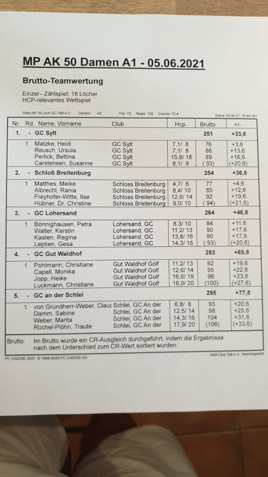 Die beste Runde lieferte Heidi Matzke mit 4 über Par (76) vom Gastgeber GC Sylt. Dies trug maßgeblich zum letzendlichen Sieg bei. GC Schloß Breitenburg, GC Lohersand und GC Gut Waldhof folgten auf den weiteren Plätzen. Leider belegte unsere Mannschaft den 5. Platz.