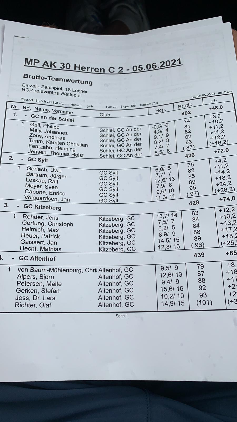 Axel Off sorgte mit seiner 82er Runde für das beste Ergebnis des Tages. Aber auch die anderen trugen mit ihren Ergebnissen zu einem guten Mannschaftsergebnis von 446 Schlägen bei. Die Mannschaft des GC Altenhof wurde mit einem Ergebnis von 481 Schlägen deutlich auf Distanz gehalten. Der GC Husumer Bucht folgte in knappen Abstand mit 485 Schlägen.
