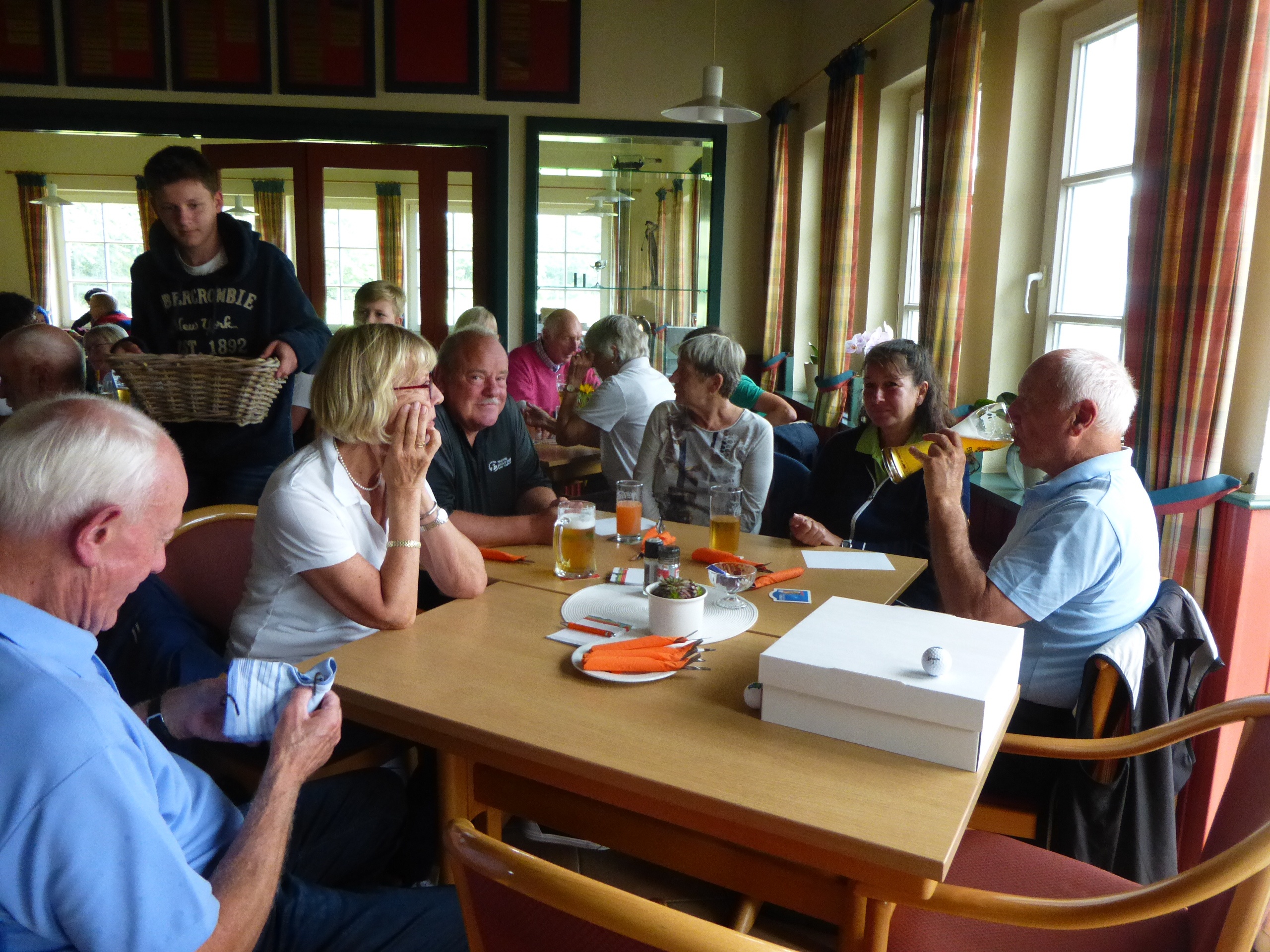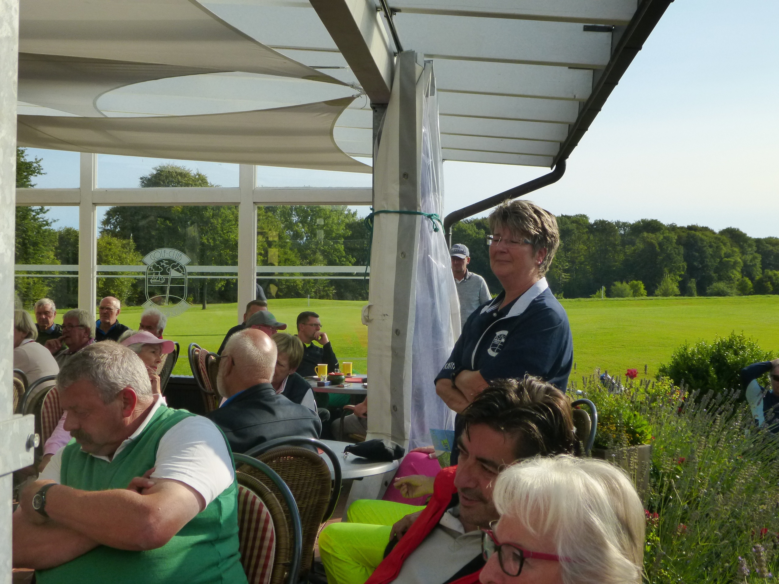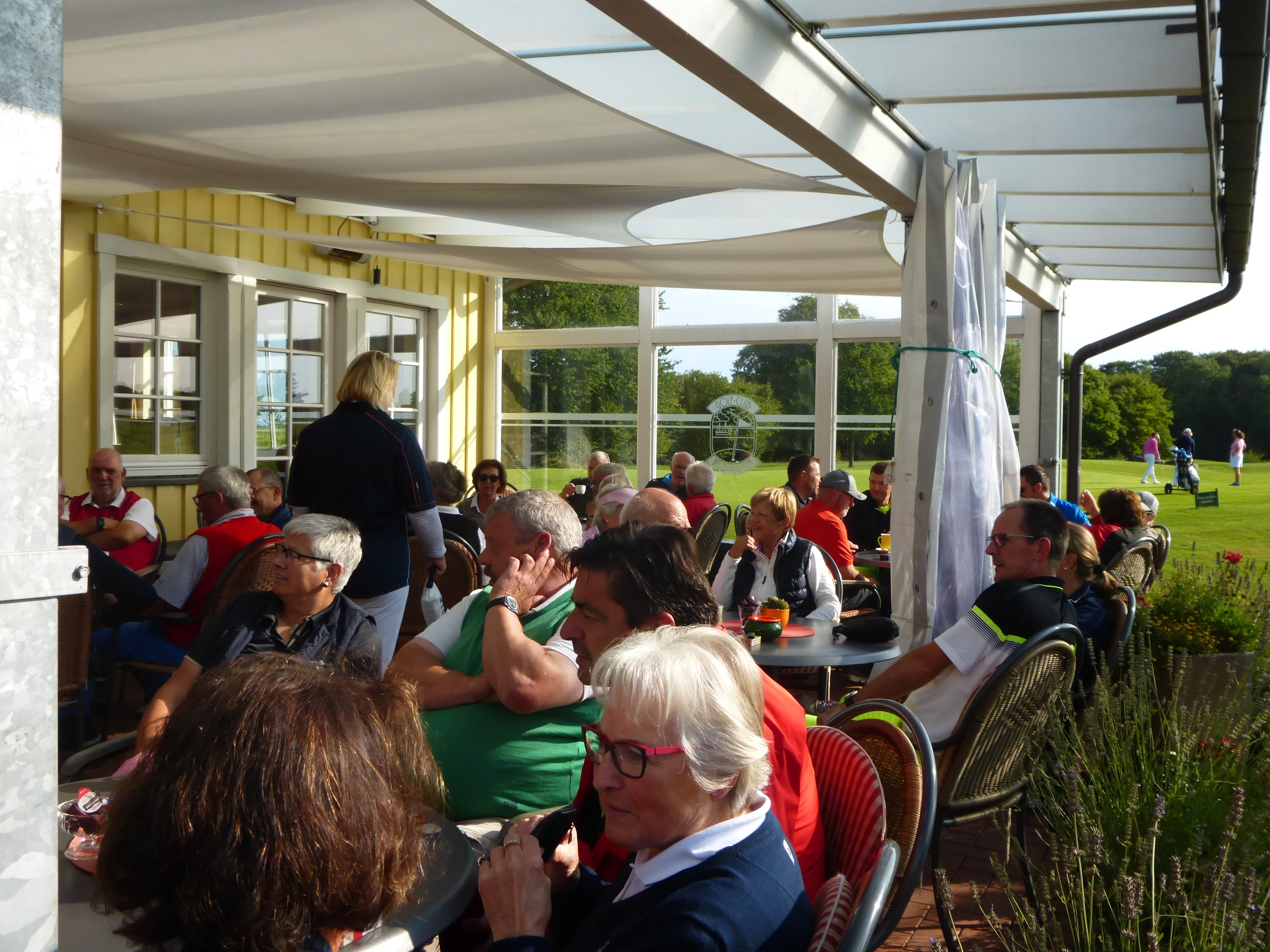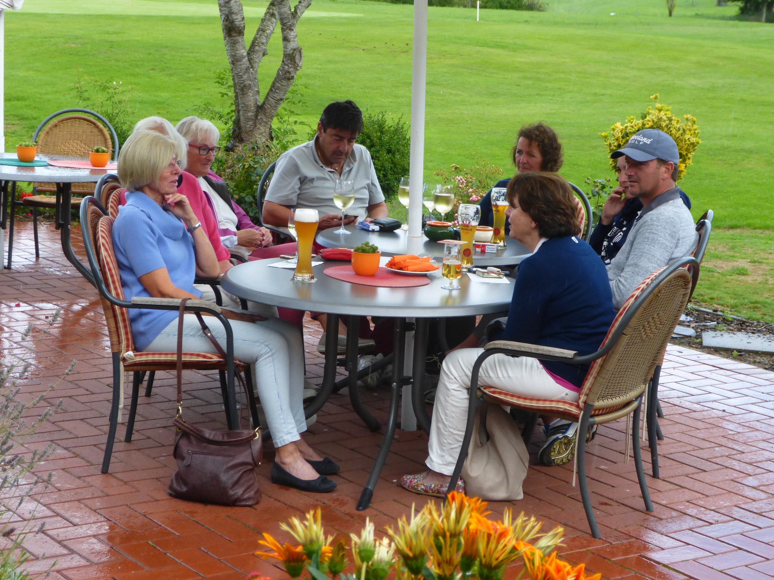 Wenn der Präsident ruft, und das zum 10. Mal, ist die Anmeldeliste schnell gefüllt. Nur mit dem Wettergott stand er in diesem Jahr nicht auf einem guten Fuß. Drei kurze und heftige Regengüsse, die zum nass werden reichten, gingen auf die Spieler nieder. Die allerdings ließen sich die Laune nicht verderben. Wurde doch ein Texasscramble zu viert gespielt und das mit Partnern, die man sich aussuchen konnte. Solche Turniere spielt man dann doch gerne. Fröhlich, mit guten Ergebnissen kamen die Spieler wieder im Loch 19 an, wo schon das leckere Essen, das Gudrun Raschke mit ihrem Team servierten, wartete.