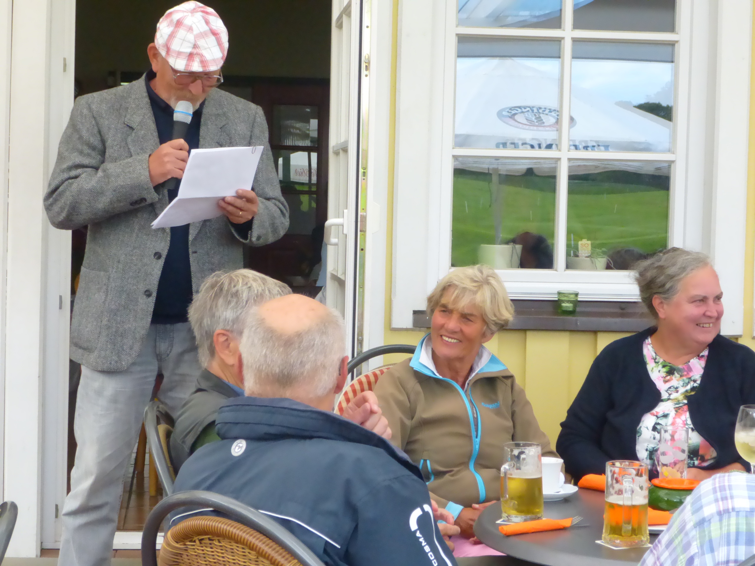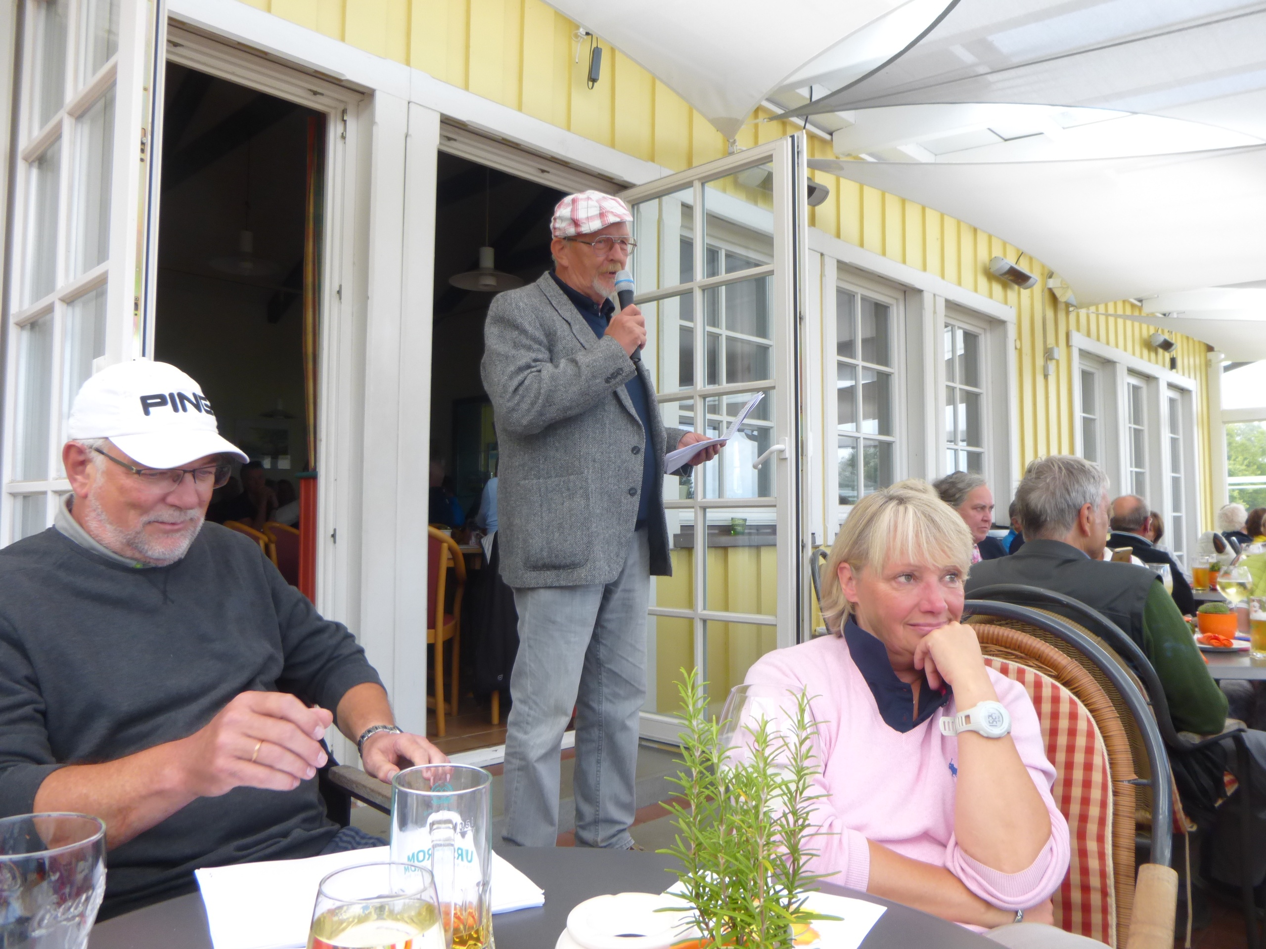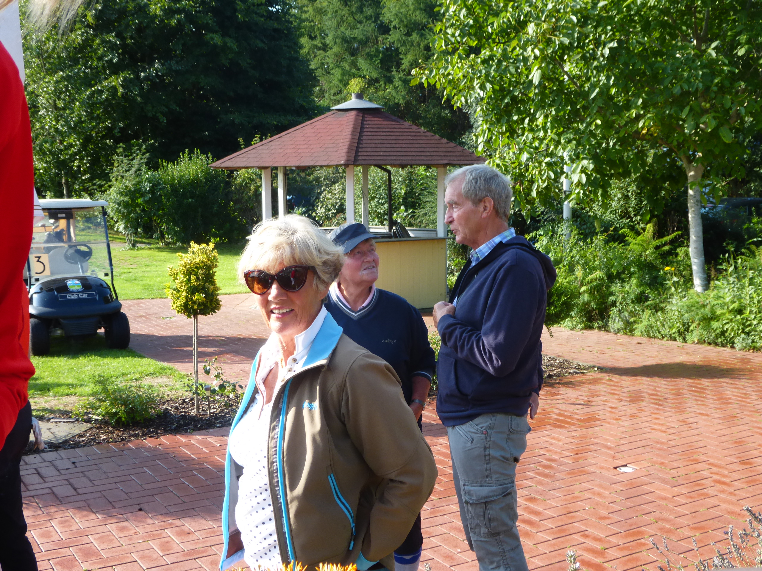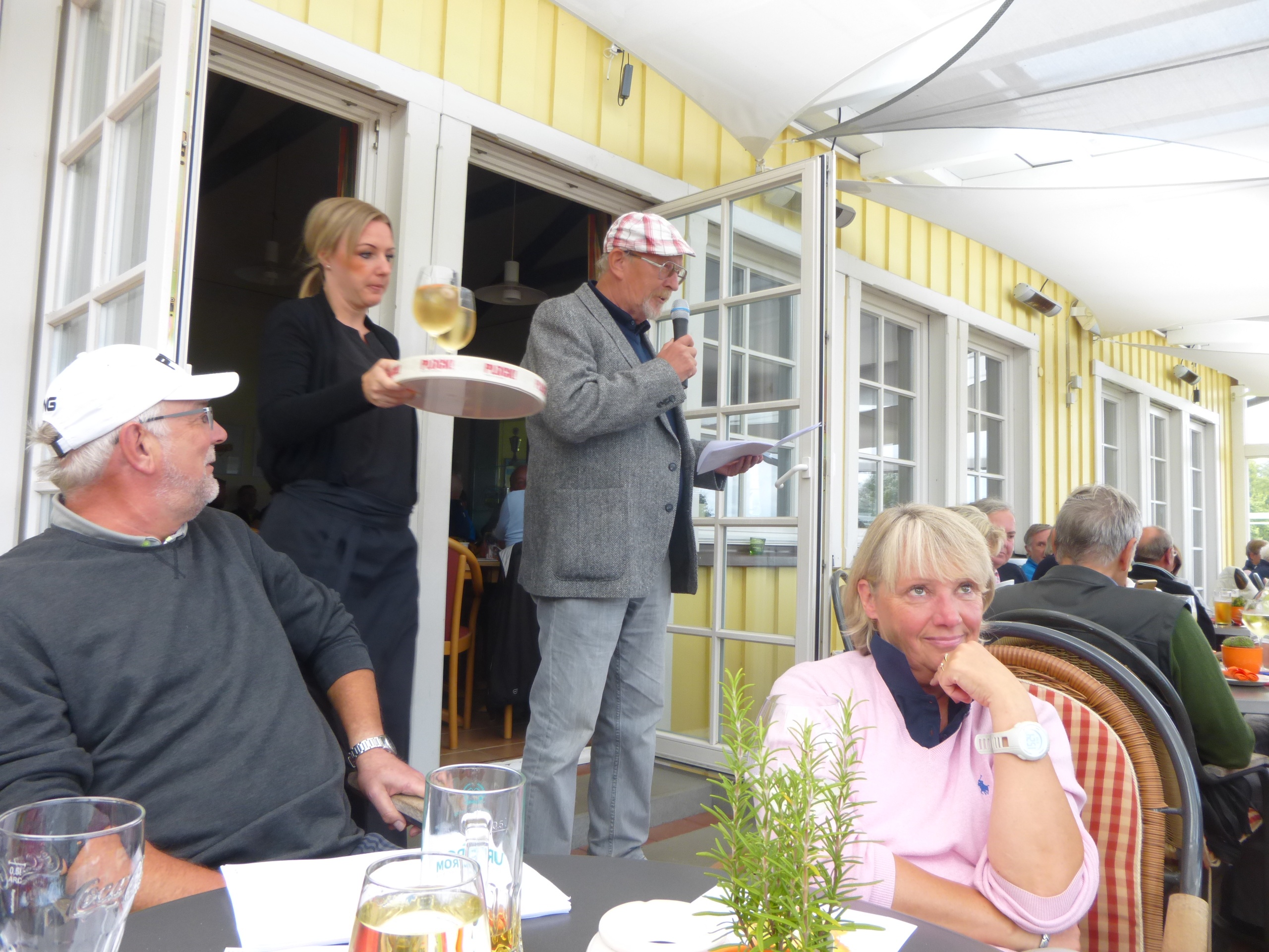 Wenn der Präsident ruft, und das zum 10. Mal, ist die Anmeldeliste schnell gefüllt. Nur mit dem Wettergott stand er in diesem Jahr nicht auf einem guten Fuß. Drei kurze und heftige Regengüsse, die zum nass werden reichten, gingen auf die Spieler nieder. Die allerdings ließen sich die Laune nicht verderben. Wurde doch ein Texasscramble zu viert gespielt und das mit Partnern, die man sich aussuchen konnte. Solche Turniere spielt man dann doch gerne. Fröhlich, mit guten Ergebnissen kamen die Spieler wieder im Loch 19 an, wo schon das leckere Essen, das Gudrun Raschke mit ihrem Team servierten, wartete.