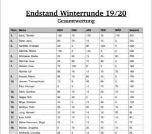 Torsten Kock konnte in 15 gespielten Runden mit 375 Gesamtpunkten mit großem Abstand diese Winterrunde für sich entscheiden. Jens Peters (13Runden,245 Punkte) und Andreas Korittke (14 Runden, 230 Punkte) folgten auf den Plätzen.
